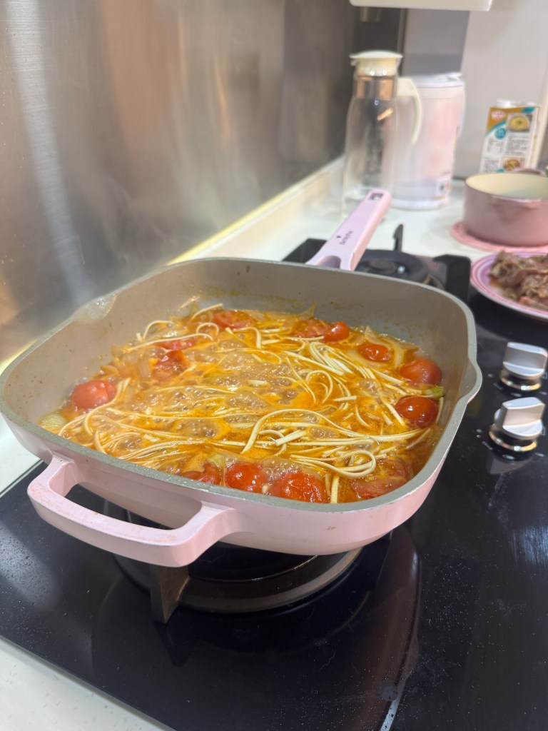 3. 同一隻鍋內,加入牛油,爆香洋蔥和車厘茄!然後加入蕃茄醬炒勻,再倒入雞湯,加少許醬油調味,煮滾之後加入烏冬煮熟,然後再加入忌廉細火煮2分鐘~把牛肉放在表面!