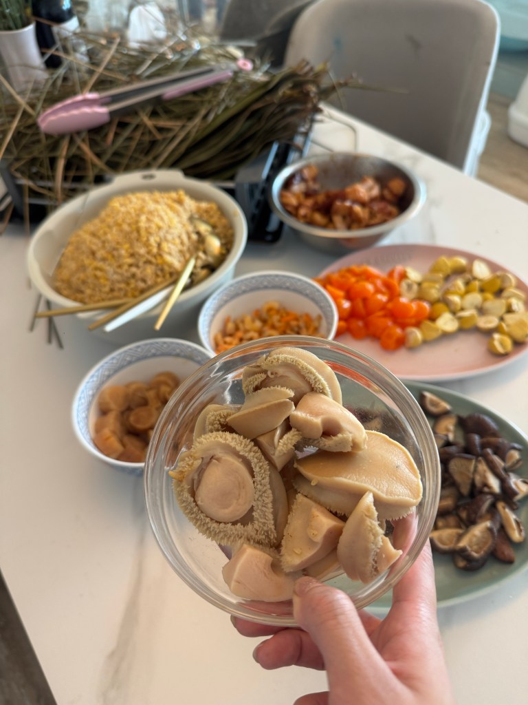 今年調返轉由我準備材料😂買咗南非鮑魚北海道瑤柱~所有材料都係買咗$800!最後包咗40隻多啲!除返開$20 隻🤣但係每隻都好足料勁好食😍🩷今年用咗鹹水草去綁啲糭!自然過用麻繩,不過就難啲綁實😆