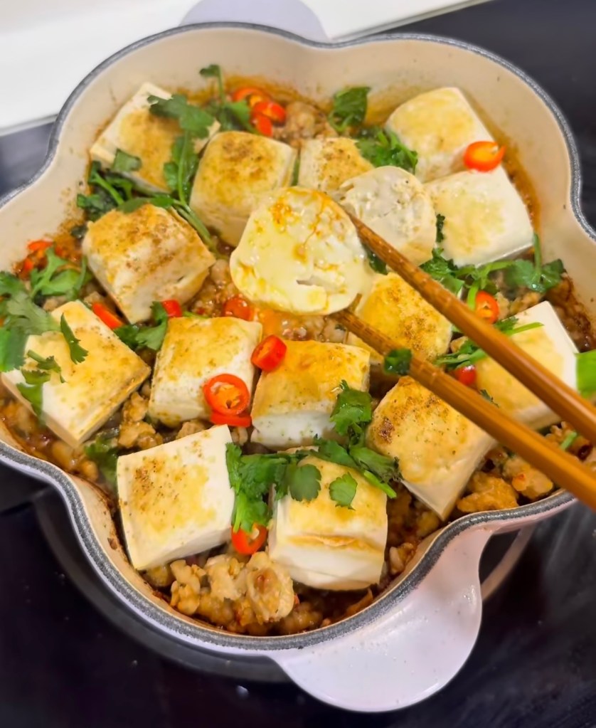 - Add tofu and cook for 2 minutes. Sprinkle cumin, drizzle with pepper oil, and garnish with coriander and chilies.