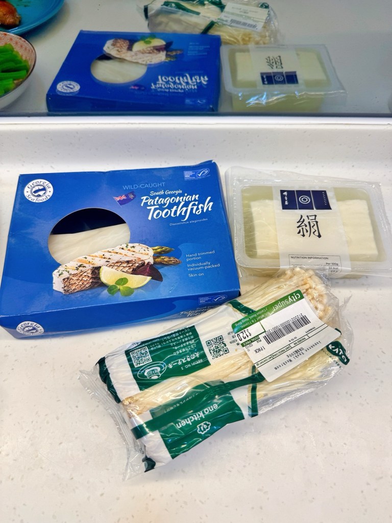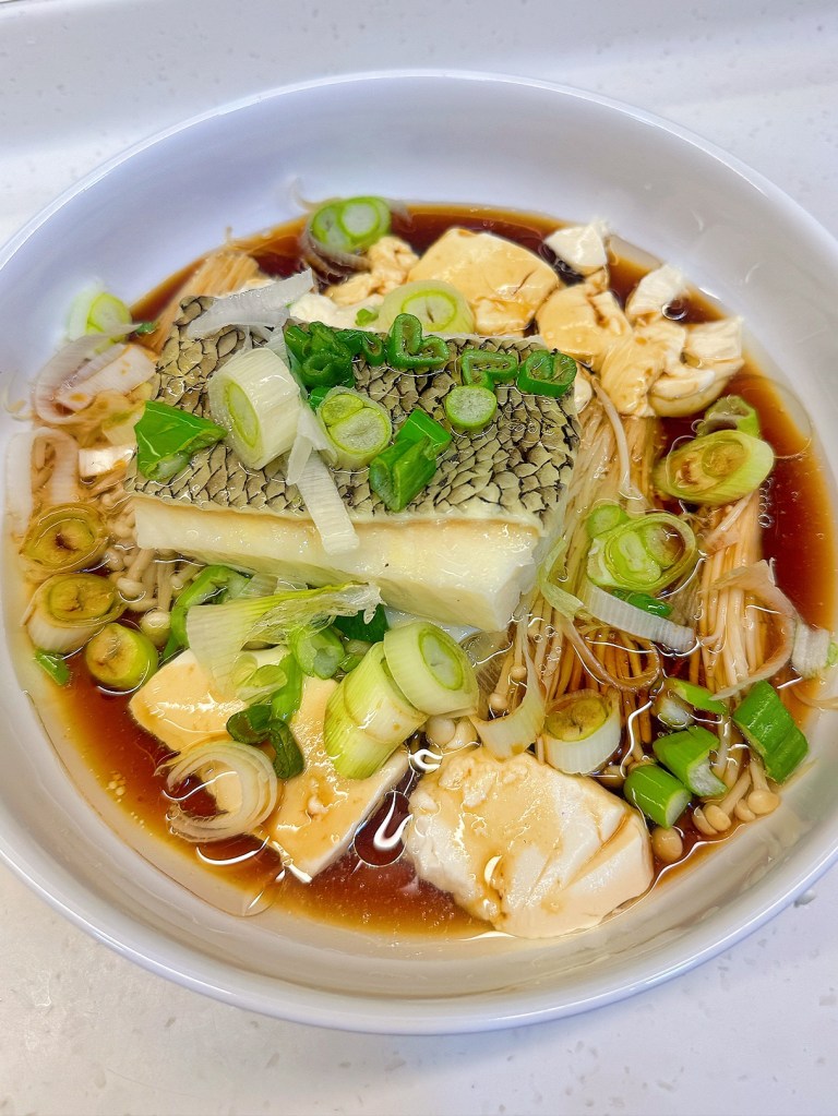 - Slice the tofu, cut off the ends of the enoki mushrooms and separate them. Arrange the ingredients on a plate, then place the white cod on top, adding a few green onions on top.