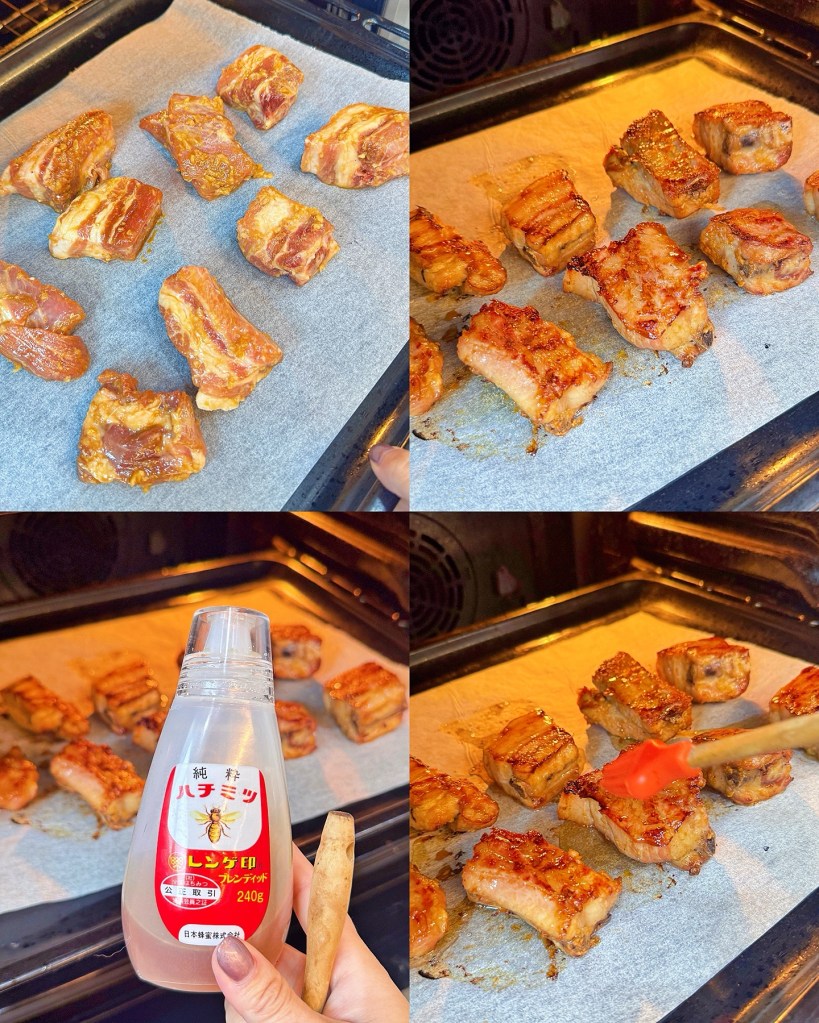 - Preheat oven to 180°C. Bake ribs for 8 minutes, flip, brush with honey, and bake for another 8 minutes until golden brown.