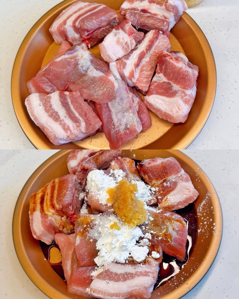 1) 豬肉加入醃料混合,至少醃15分鐘!有時間嘅話放入雪櫃醃過夜更好~
