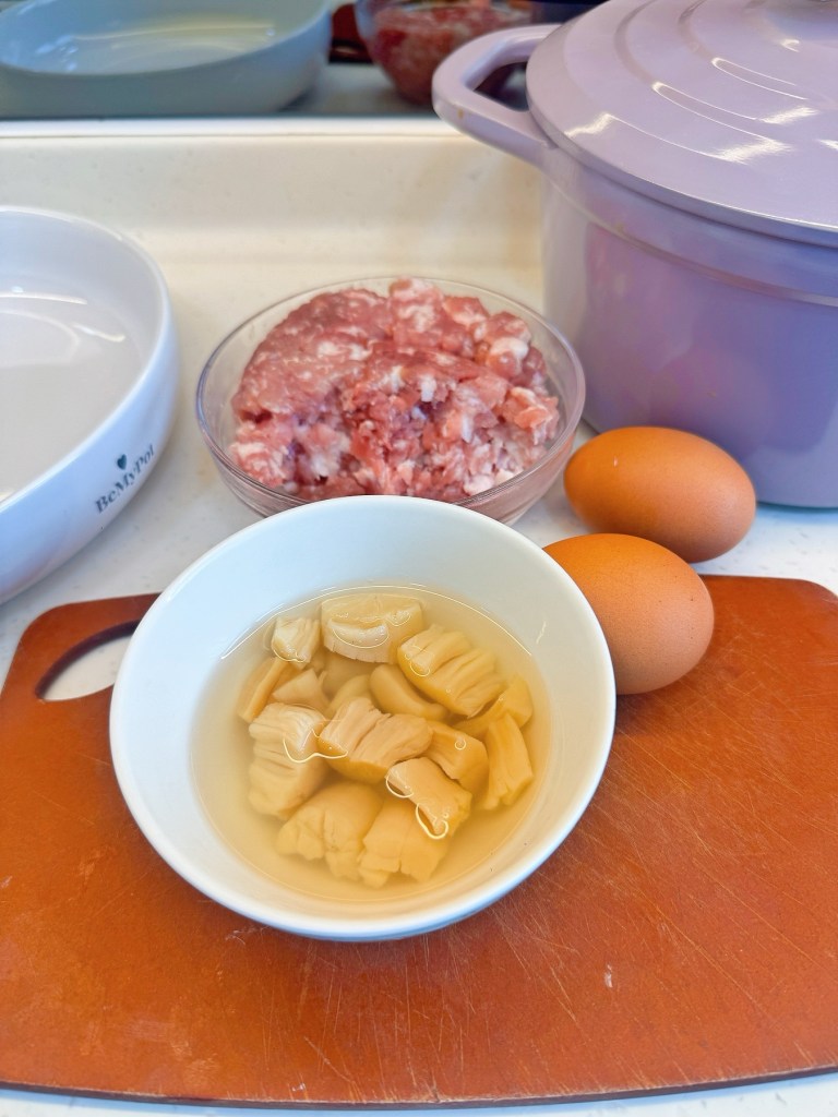 2) Add a teaspoon of soy sauce to the ground pork and mix well. Soak the dried scallops in hot water.