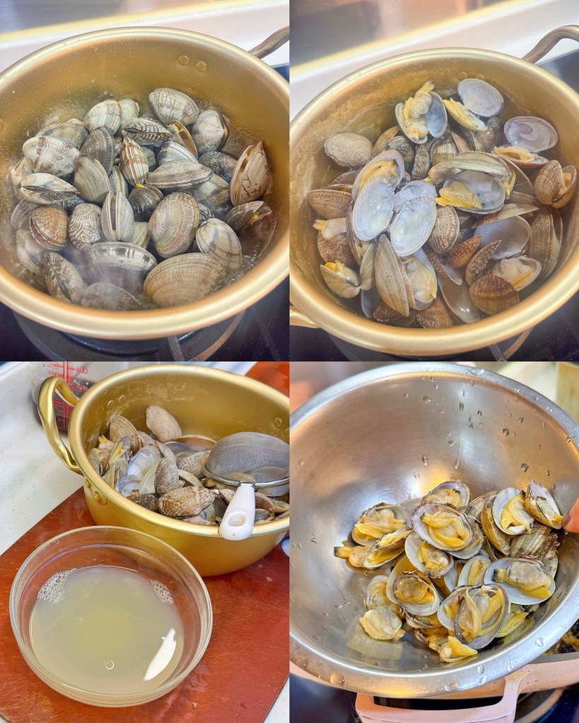2)蜆加入滾水中煮至開口,煮蜆水留起備用!蜆可以去一半殼