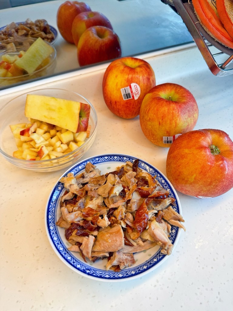 - 電飯煲煲好白飯!蘋果切粒!燒鴨用手撕開鴨肉!