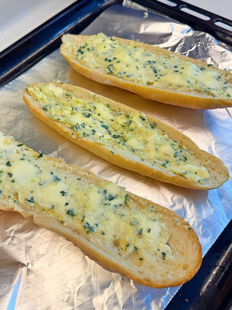 - 牛油室溫放軟!parsley切碎!所有材料攪拌均勻!然後塗在麵包上,放入焗爐180度10分鐘就得💞