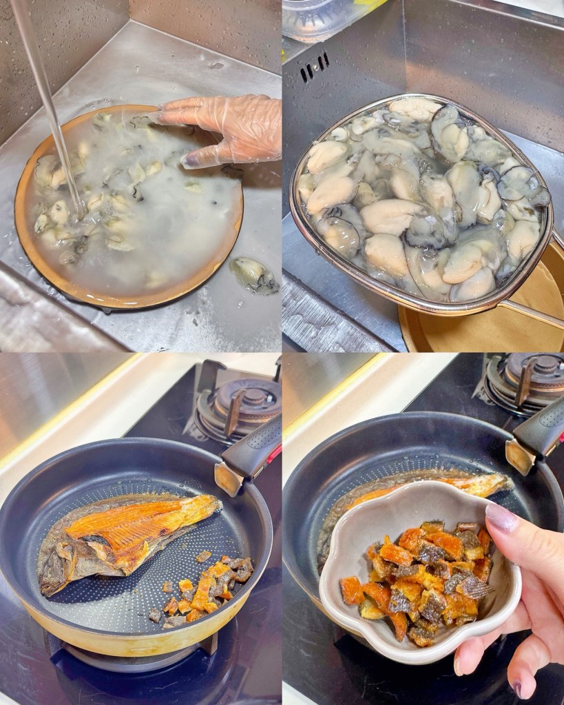 1) 豬肉加入醃料醃5分鐘,冬菇用水浸淋切片,蠔仔用生粉洗淨