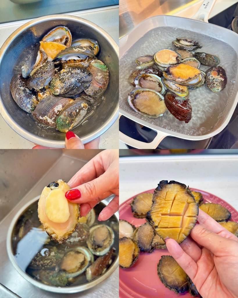 - Clean abalone, boil for 5 minutes, then ice bath. Remove shell and innards, score the back.