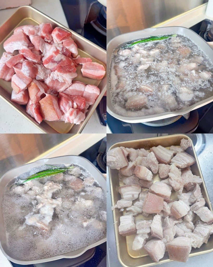 - Boil water with half the ginger and spring onions, then add pork belly and cook for 5 minutes. Rinse with cold water.