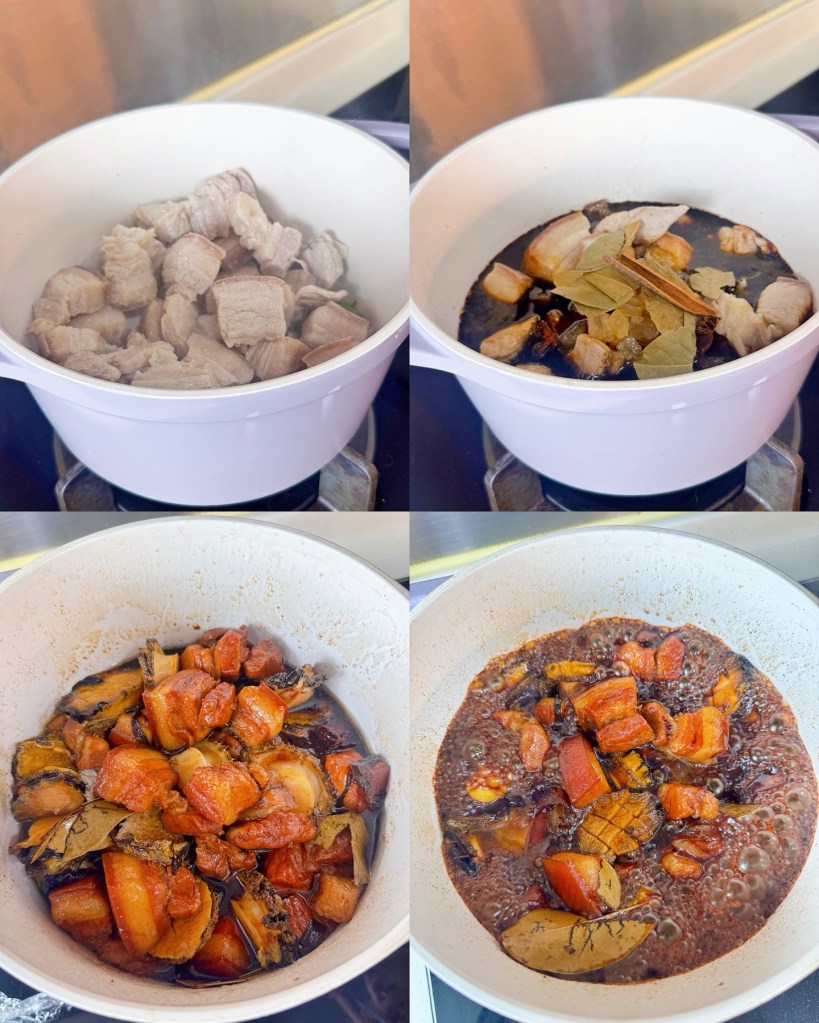 4) 煮滾後轉小火炆約40分鐘-1小時至豬肉軟稔,再轉大火,加入鮑魚 煮5分鐘把醬汁煮至厚身!