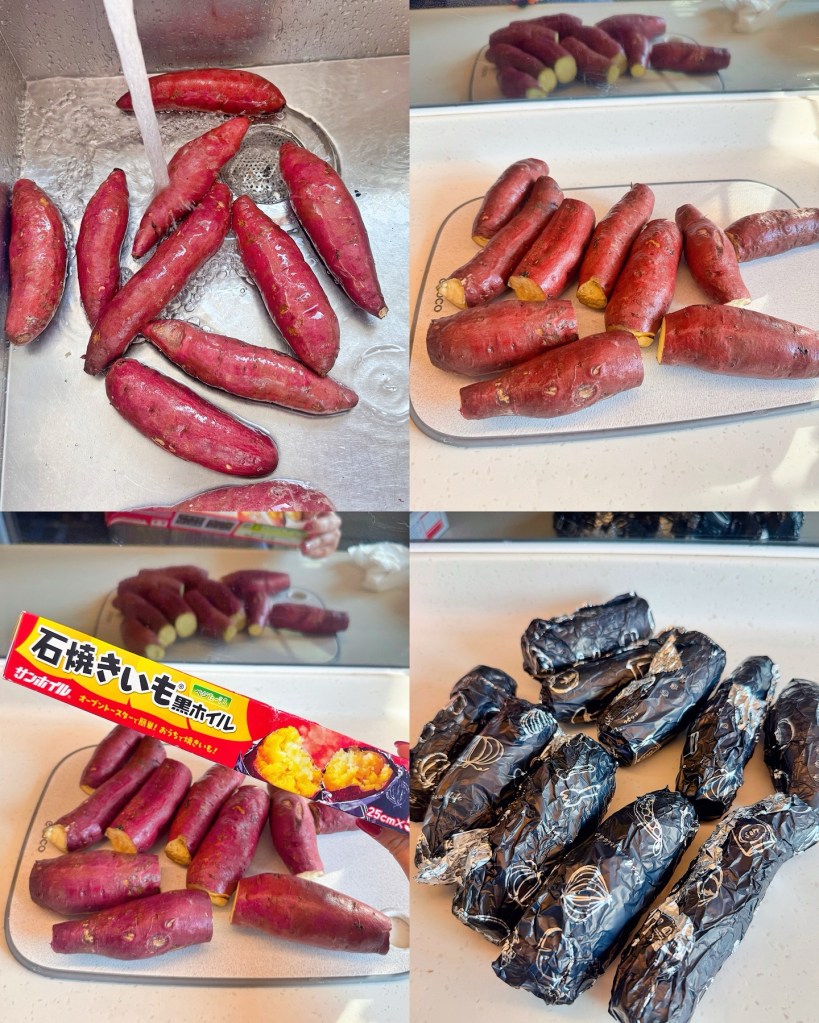 - After washing the sweet potatoes, dry them and wrap them in aluminum foil.