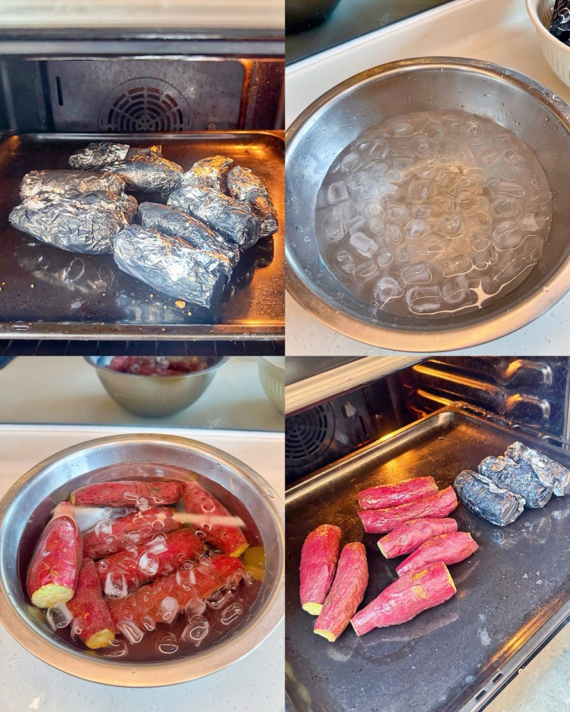 - Place them in the oven and bake at 190 degrees Celsius for 25 minutes. Then remove them, take off the aluminum foil, and soak the sweet potatoes in ice water for 3 minutes. Finally, put them back in the oven and bake at 210 degrees Celsius for another 25 minutes, and they are ready!