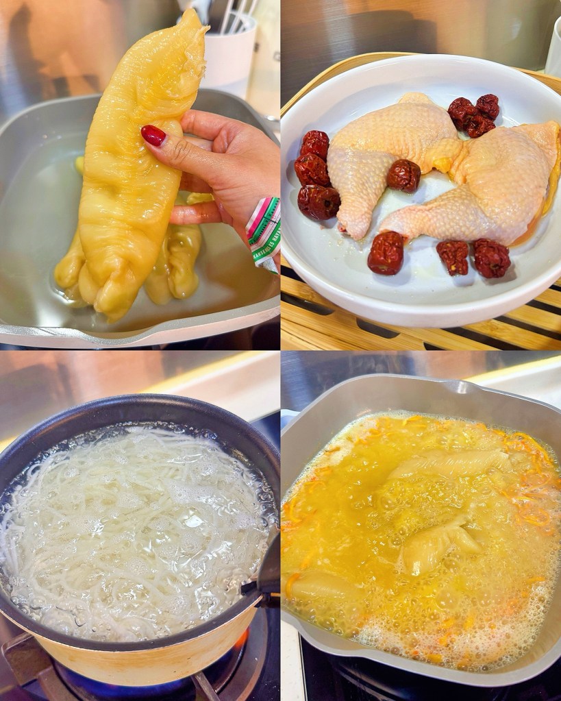 3) Bring the chicken stock to a boil, add the rehydrated fish maw and cordyceps flowers, and simmer for 15 minutes. Add the chicken drumsticks and red dates, garnish with coriander, and season with salt if desired.