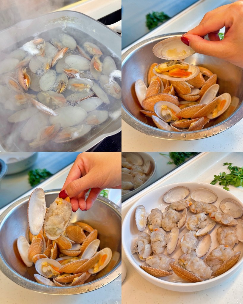 1) Salt-soak clams ~1 hour; boil briefly, remove when they open. Spread shrimp paste over clams.
