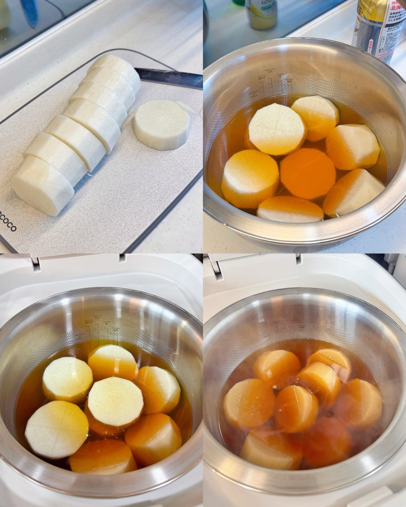 - 電飯煲中倒入湯底材料,再加入白蘿蔔,然後煮兩個小時~最後可以加入蔥花芝麻辣椒仔即成~