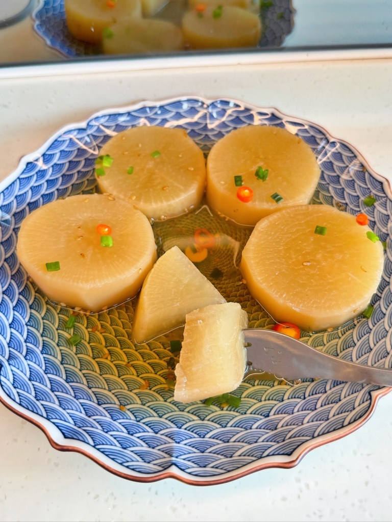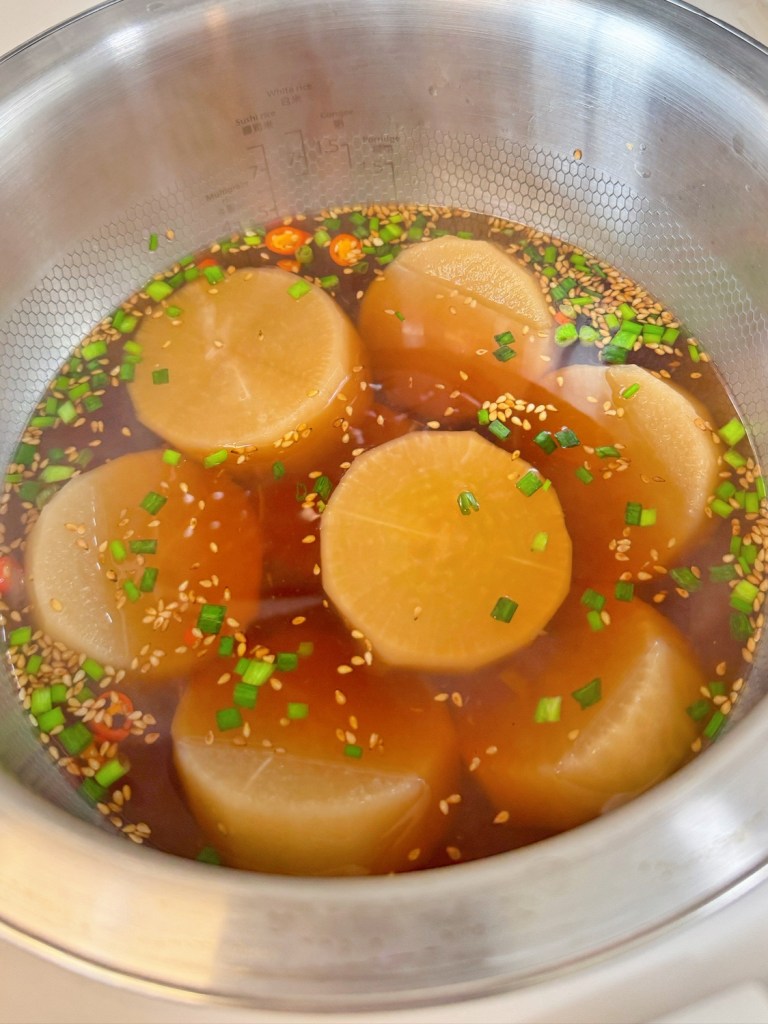 - In a rice cooker, add the broth ingredients, then add the radish, and cook for two hours. Finally, add the spring onion, sesame, and chili peppers, and it’s ready.