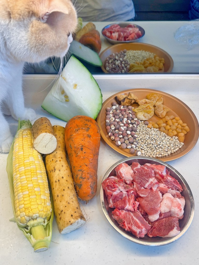 - Soak the dried ingredients for 15 minutes, then rinse. Cut the corn and winter melon into chunks. Peel and cut the carrot and Chinese yam into chunks. Remember to wear gloves when handling fresh Chinese yam. Soak the dried mandarin peel for about 15 minutes until soft, then gently scrape off the white inner layer.