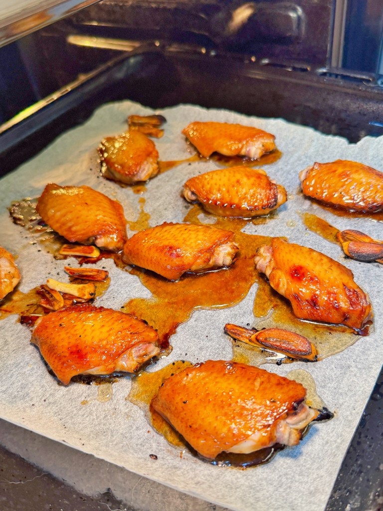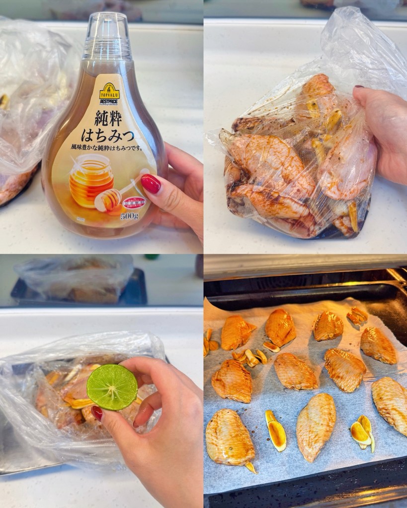 - Line a tray with parchment, place wings, garlic, and lime. Bake for 10 min, flip, bake another 10 min. Brush with honey, then bake at 220°C (428°F) for 5 min. Enjoy!