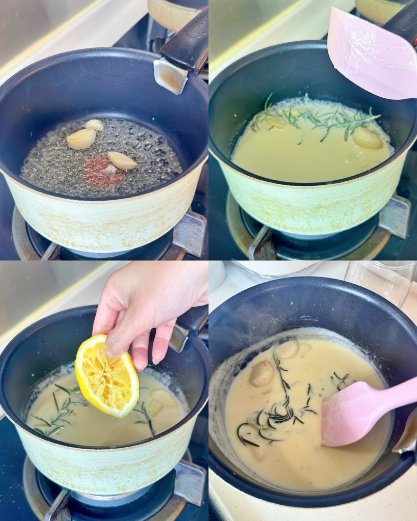 - 蒜頭拍扁,加入白酒和rosemary中用細火煮至酒精揮發,然後便加入忌廉,繼續用細火不斷攪拌,直至汁變得厚身!然後再加入檸檬汁煮多1分鐘,熄火後便可以加入凍牛油攪拌均勻!再加入海鹽和黑胡椒!