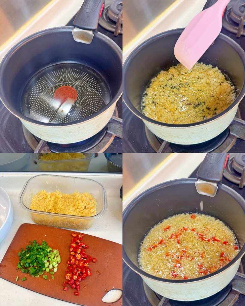 - 油煮滾後,加入2/3蒜蓉用細-中火不斷炒5分鐘!微微金黃色後便可以熄火!然後再加入餘下的生蒜蓉,和其他調味料攪拌均勻~