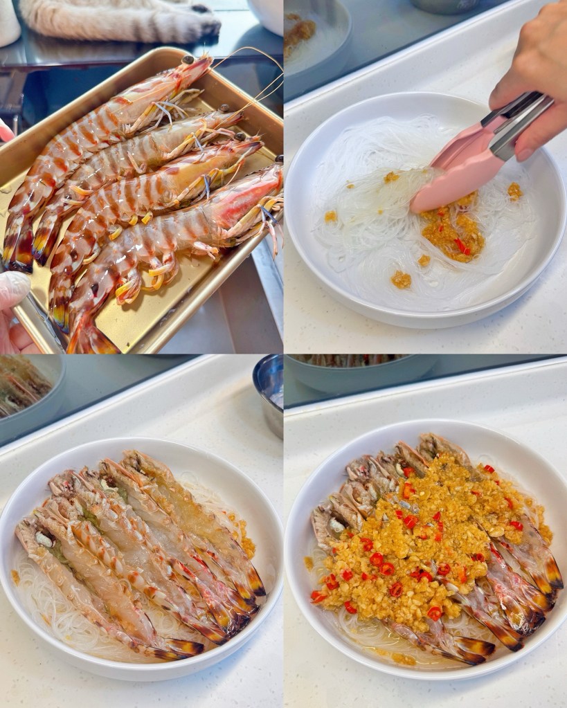 - 粉絲用熱水浸淋,加入少許蒜蓉金醬攪拌均勻,然後表面鋪上大蝦,再鋪上蒜蓉金醬,隔水大火蒸6至8分鐘,最後灑上蔥花即成!