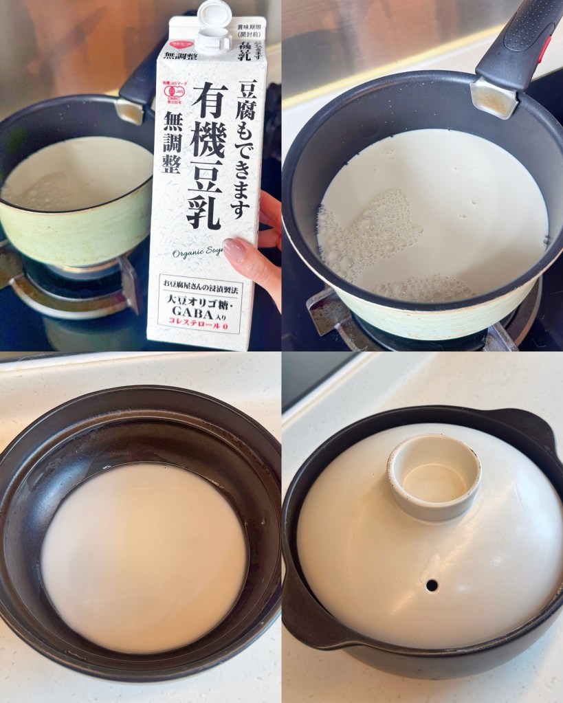 - Heat soy milk on low until just simmering, remove surface foam, then pour from height into powder.