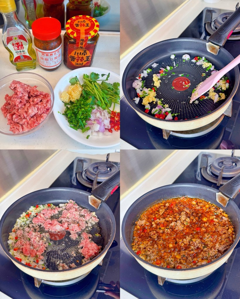 牛肉碎 150g,蒜蓉1湯匙,乾蔥蓉1湯匙,蔥花2湯匙,辣椒碎1湯匙,芫荽 適量,豆瓣醬1湯匙,麻辣醬1湯匙,糖1茶匙,生抽1湯匙