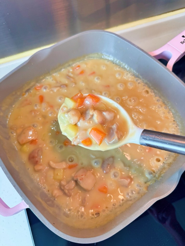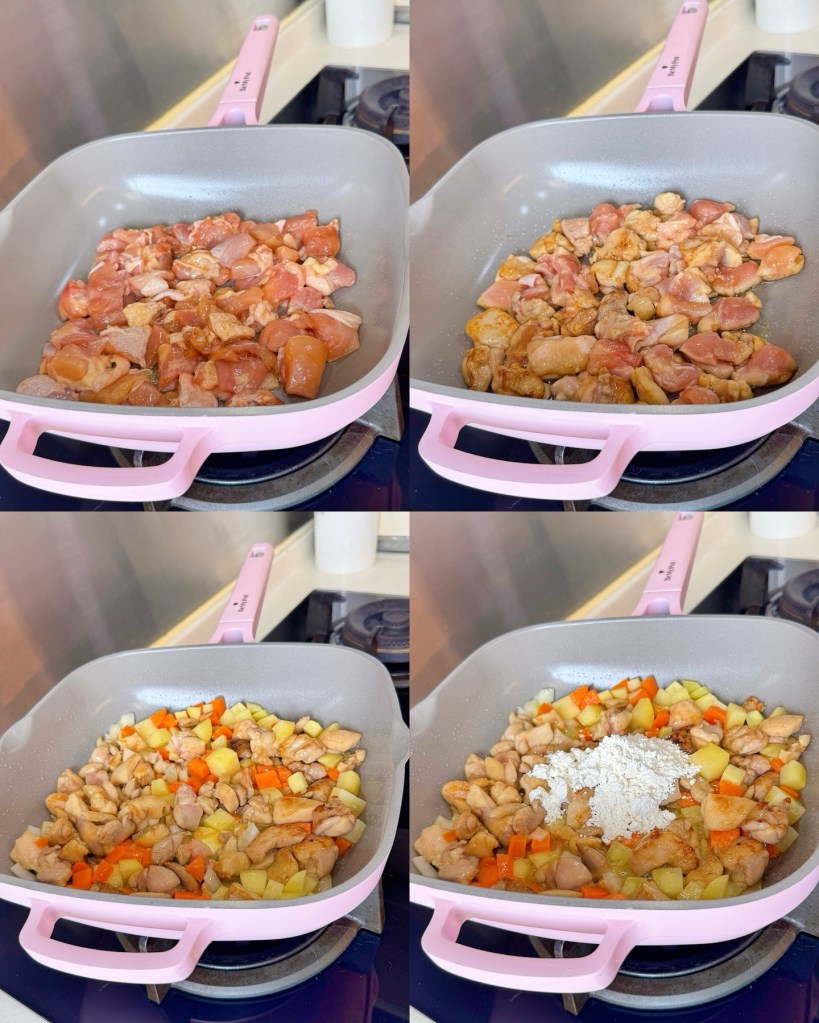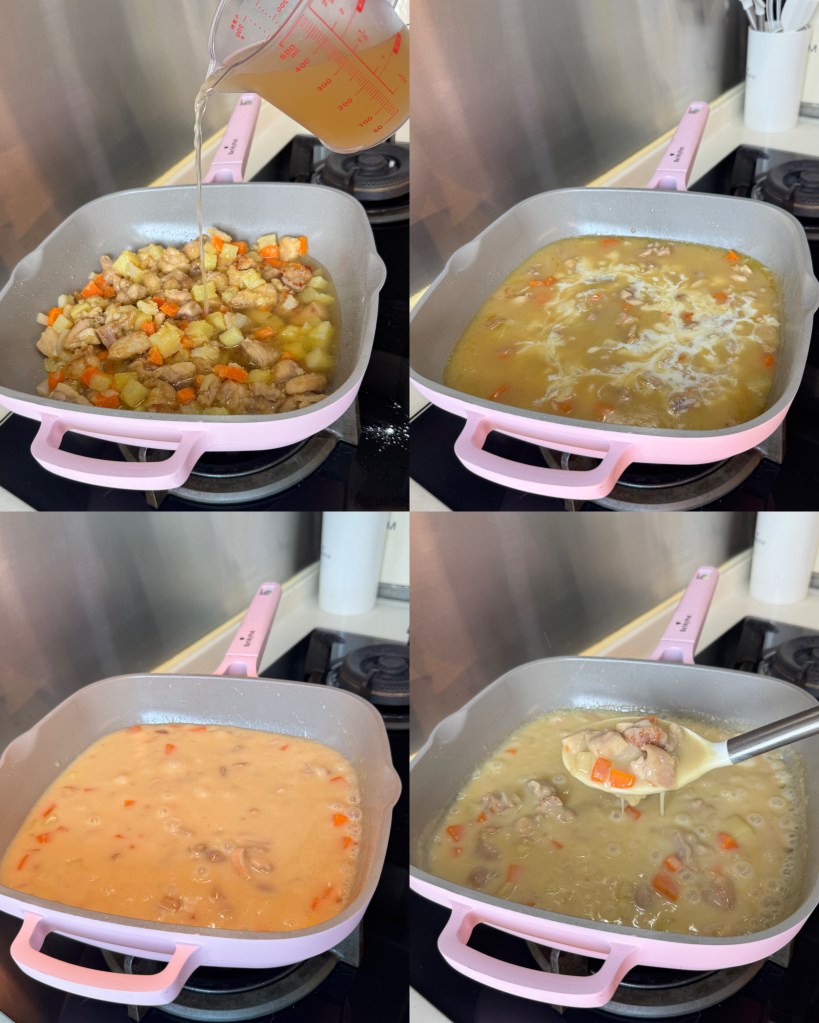 - 熱鍋下橄欖油,加入雞粒兩邊煎至微微金黃色!然後再加入其他蔬菜材料爆炒!加入牛油攪拌均!然後再加入麵粉攪拌至無粉粒!倒入雞湯,細火煮15分鐘!