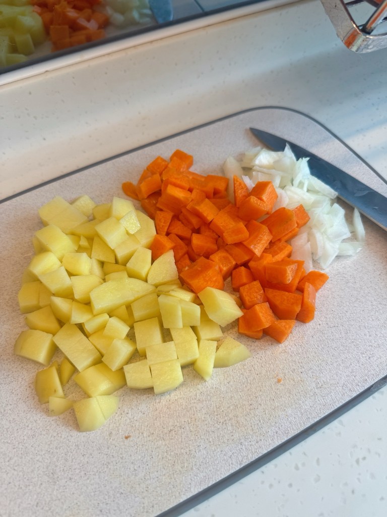 - Dice carrot, potato, and onion.
