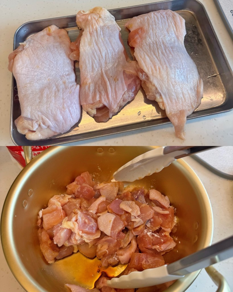 - Dice chicken, mix with marinade, marinate 10 min.