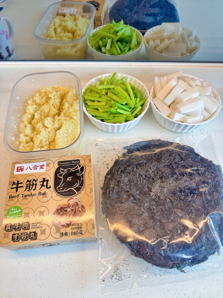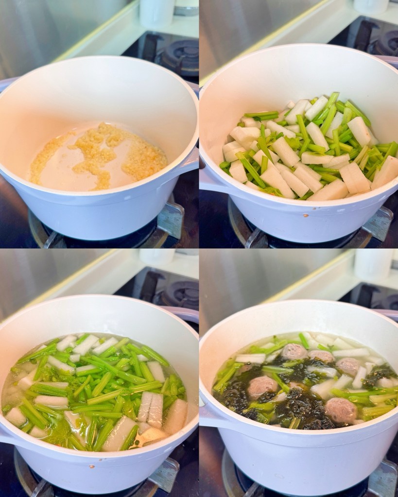 Beef balls (10), celery (1 large), white radish (1), dried seaweed (1 sheet), minced garlic (3 tbsp), sugar (1/2 tsp), salt (a pinch), boiling water (1000 ml).