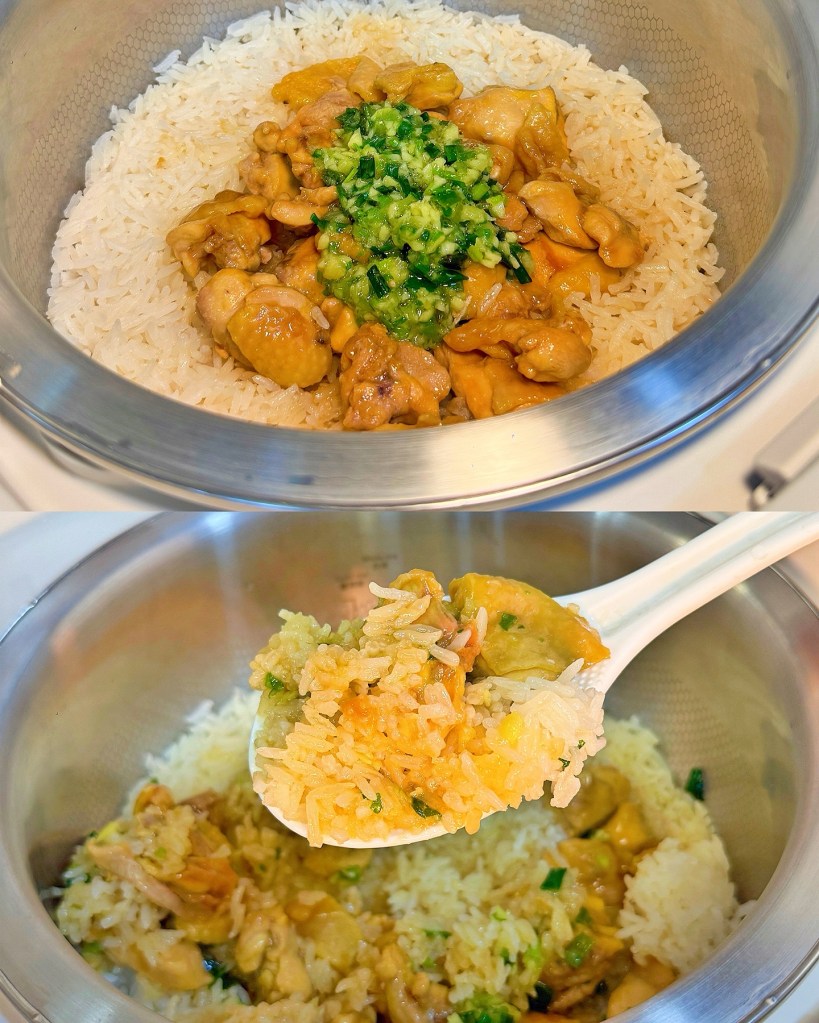 - Use 90% of the normal rice-to-water amount (because the chicken will release water)