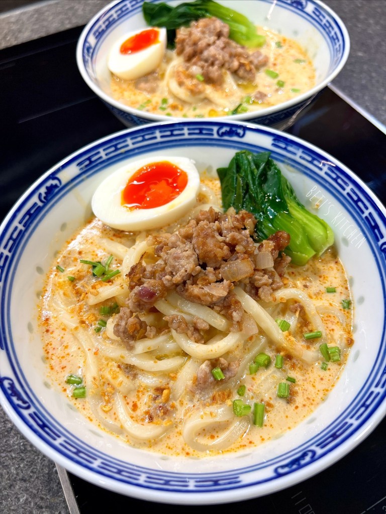 15分鐘就整到個湯底😌So easy comfort food! 西斑牙黑毛豬配日本擔擔烏冬🇯🇵😽(改做個咁嘅名應該係會好食啲😹) 其實本身想用麵!但唔記得咗買,就向冰箱用個急凍烏冬取代🤫都好好食❣️湯底學日本餐廳做法用無糖豆乳,會比只用雞湯更加濃厚💕