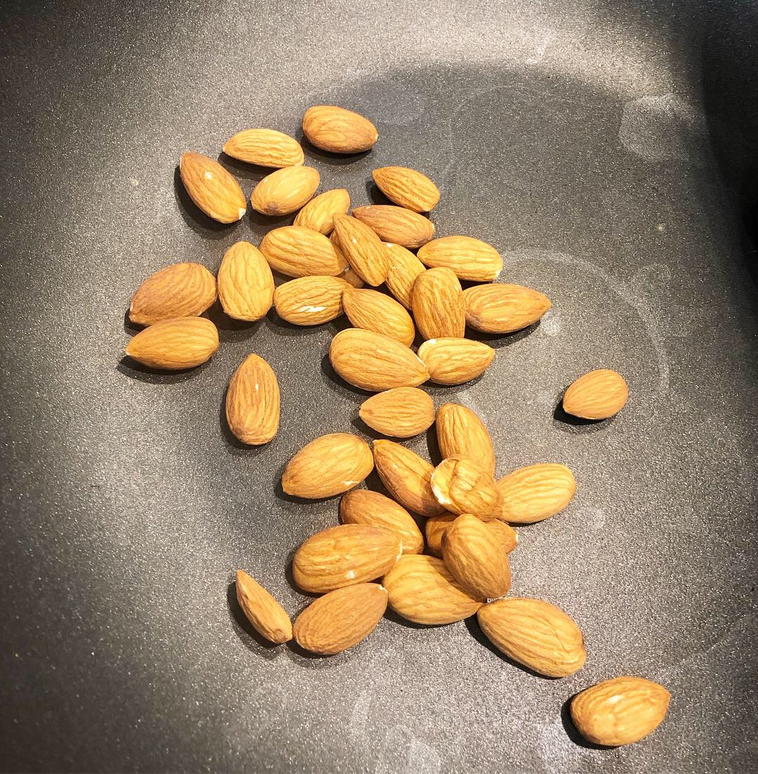2) 紅椒切碎,杏仁白鑊輕輕烤香後壓碎