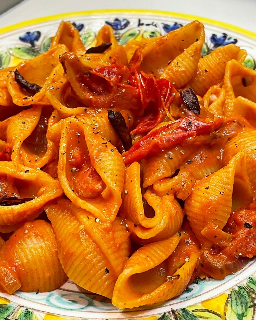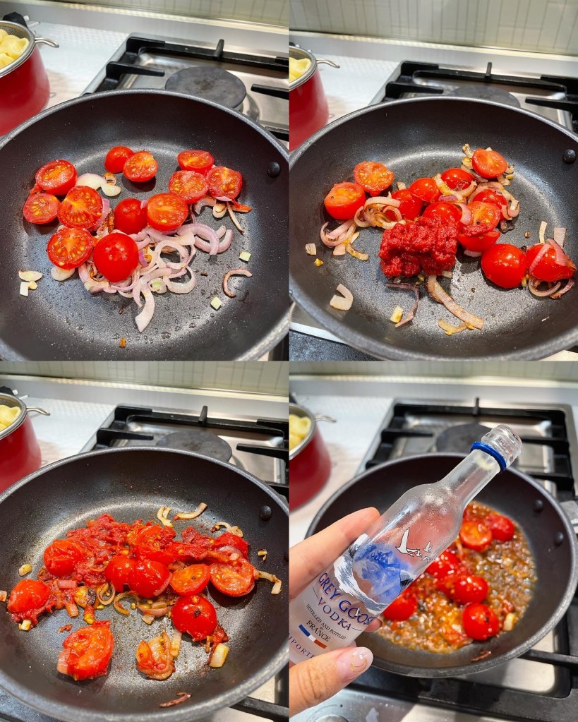 3) 加入Vodka攪拌均匀,轉小火加燕麥淡奶攪拌均匀至醬汁變稠,加入意粉攪拌均匀至吸收醬汁,再加入糖、適量鹽和黑椒碎調味即可