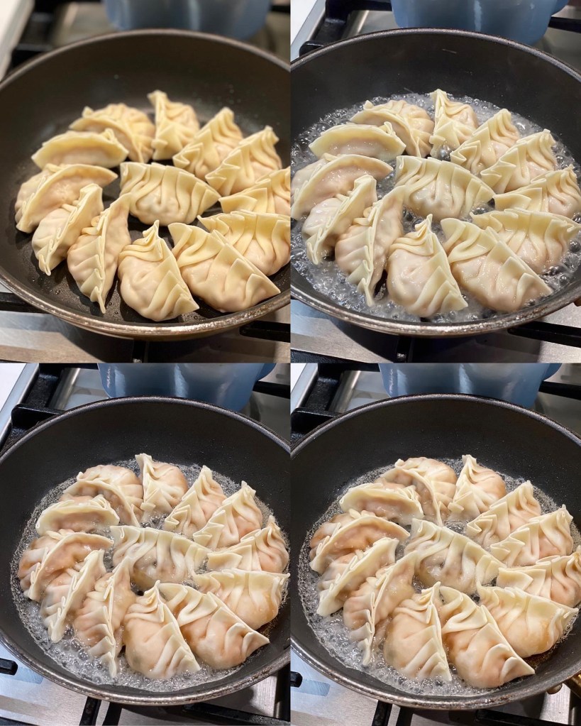 6) 熱鍋下油,中火加入餃子1分鐘後加入30ml水,繼續煮5分鐘