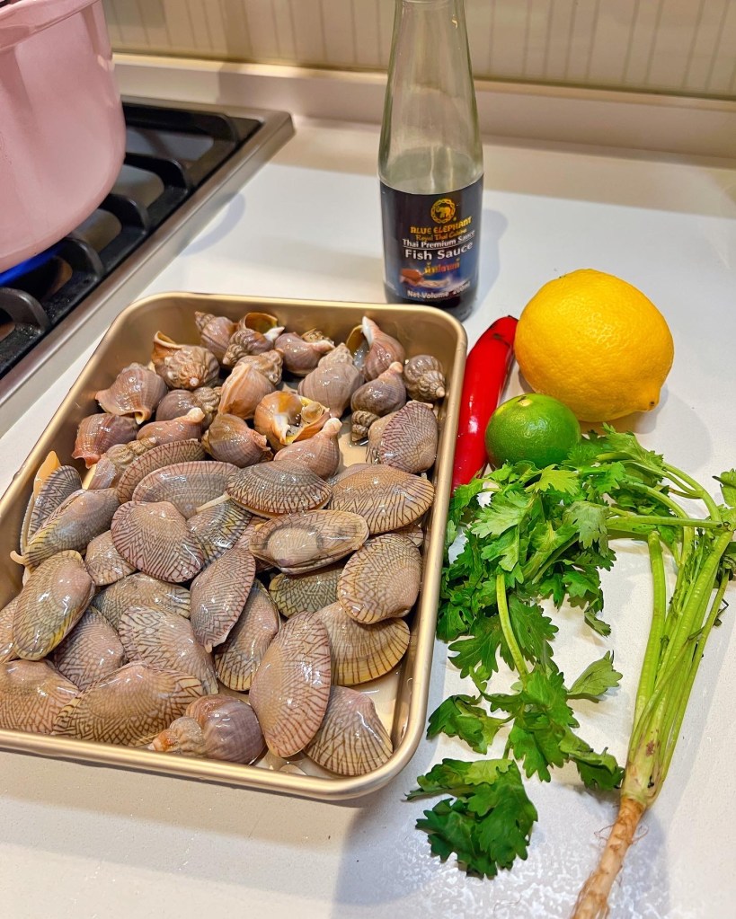 1) 花甲先浸洗,鍋中水滾後加入花甲大火煮至開口,拿起沖一沖凍水,再移走另一邊殼