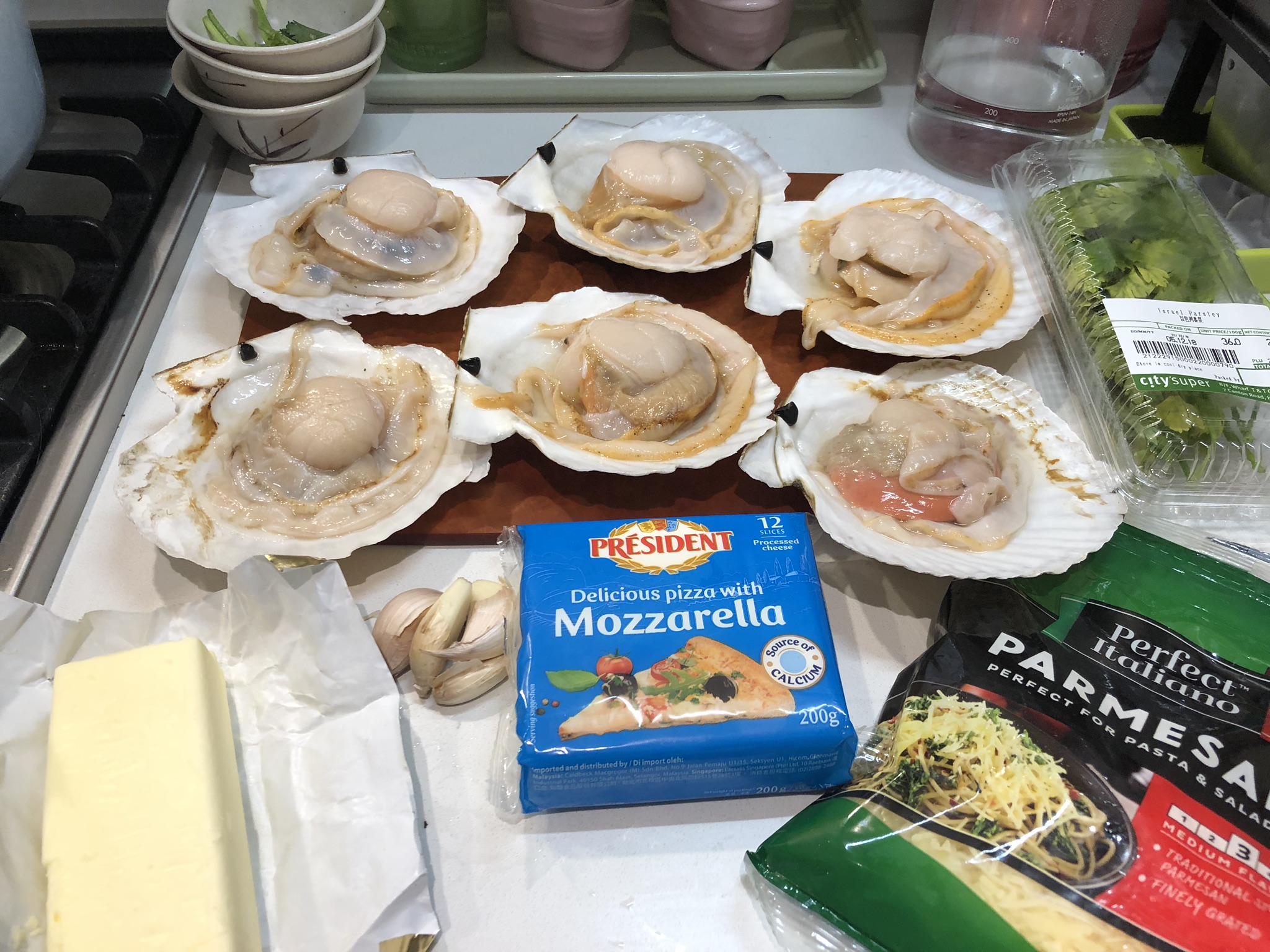 Ingredients: 6 half-shelled scallops if using frozen, thaw before use 30 grams melted salted butter cubed 4 cloves garlic, minced 60 grams shredded Mozerella cheese 30 grams grated Parmesan cheese Freshly cracked black pepper Fresh Parsley chopped finely Lemon wedges