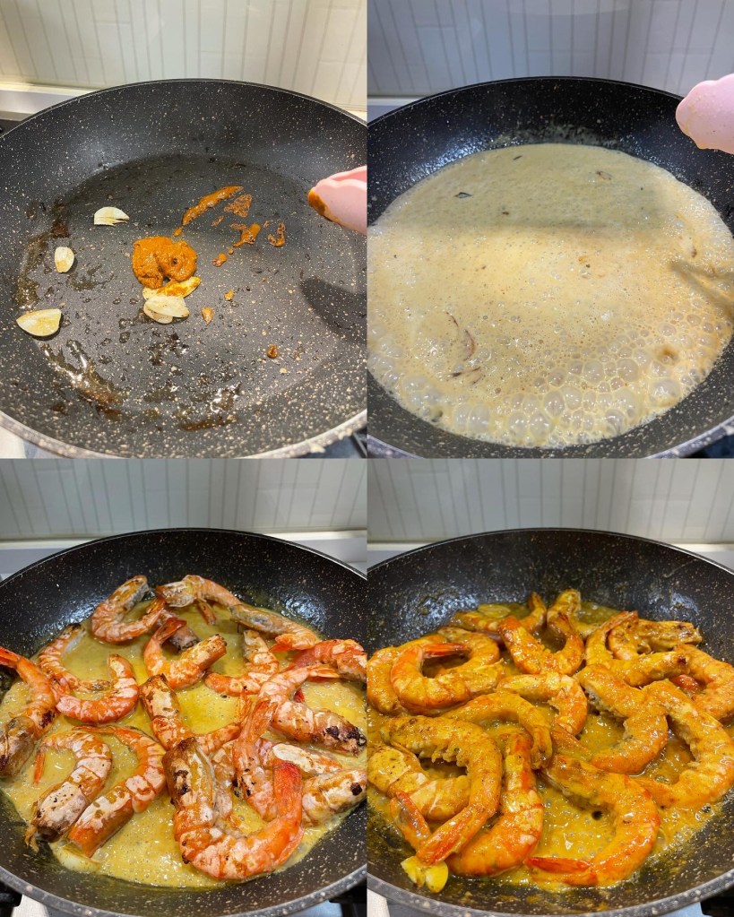 3) 原鍋加入少少油,爆香蒜片,之後再爆香咖哩醬,倒入椰奶、魚露和糖,再加入蝦煮至汁濃即成