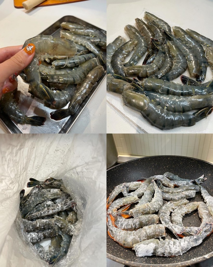 1) 蝦去腳去腸和蝦鬚!背部開邊!用廚房紙巾抹乾!平均灑上生粉!