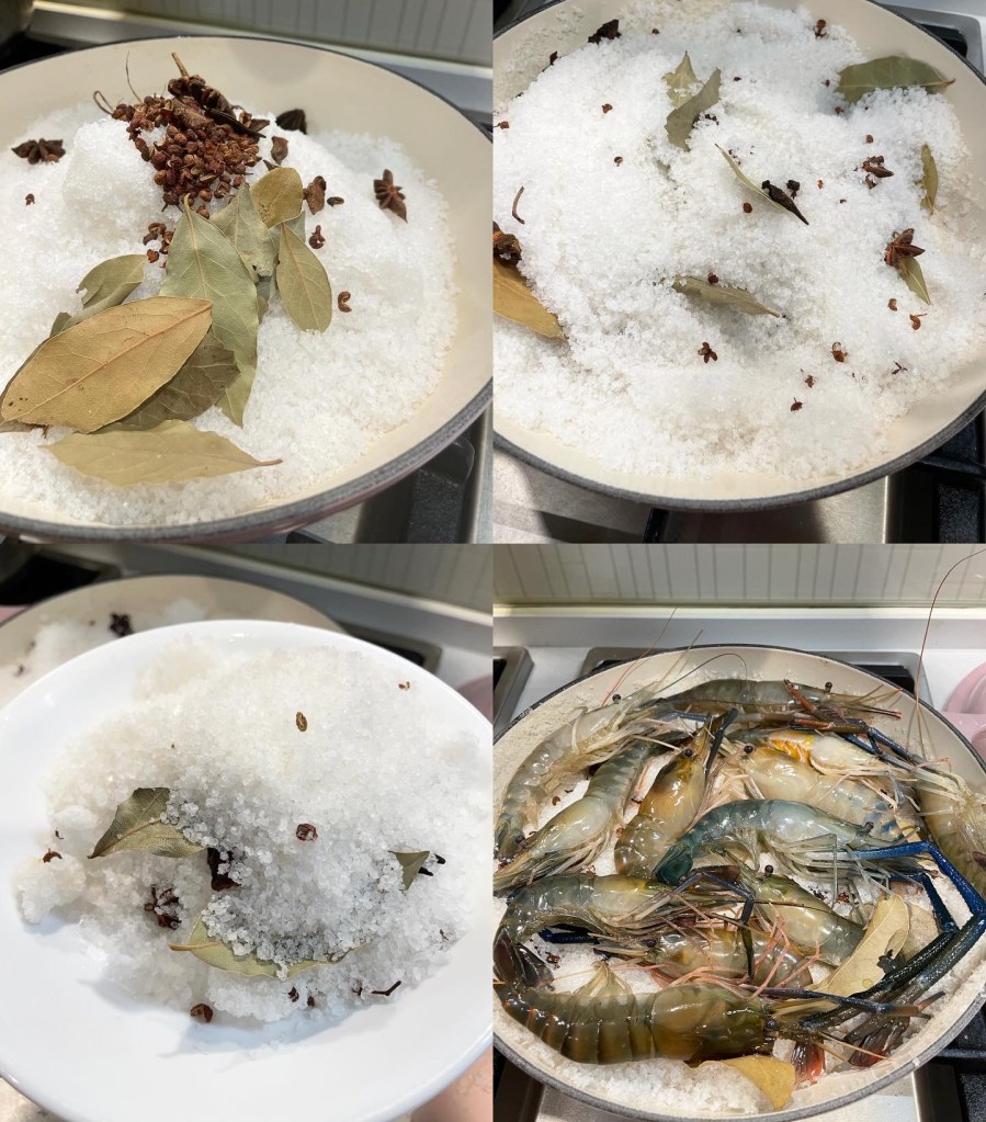 2) 燒熱鑊,下牛油,把粗鹽倒入,把鹽中火炒至熱身,加香葉、八角、花椒拌勻,把一半的鹽拿起,再將蝦放入,把拿起了的鹽放上,將蝦埋在鹽堆中!然後在邊位倒入一圈一湯匙的紹興酒!