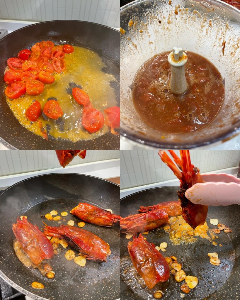 2) 熱鑊下牛油爆香一半蒜片,再加入紅蝦頭大火爆香2分鐘,倒入白蘭地煮至酒味蒸發,轉細火,壓出蝦頭裏面嘅蝦膏同汁,加入車厘茄和番茄醬小火煮5分鐘,拿走蝦頭,加鹽和黑椒調味,再加入意粉煮至汁濃盛起