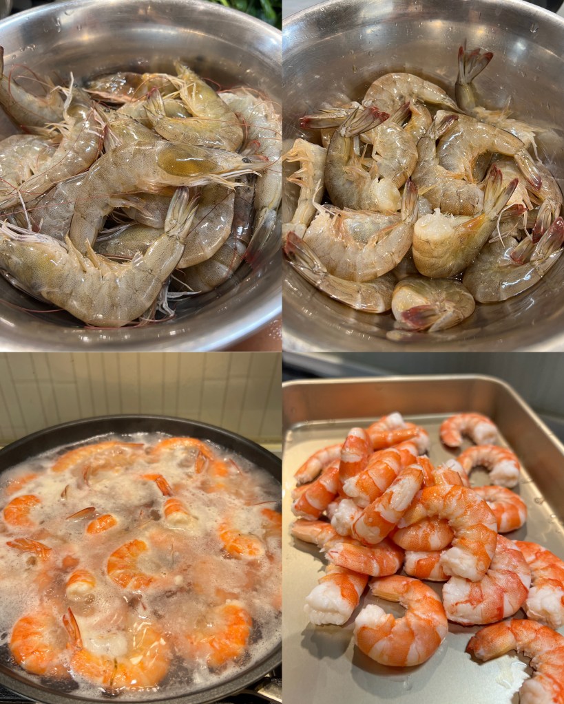 2) 海蝦去頭備用,蝦身放入滾水中,大火煮熟,拿起去蝦殼備用