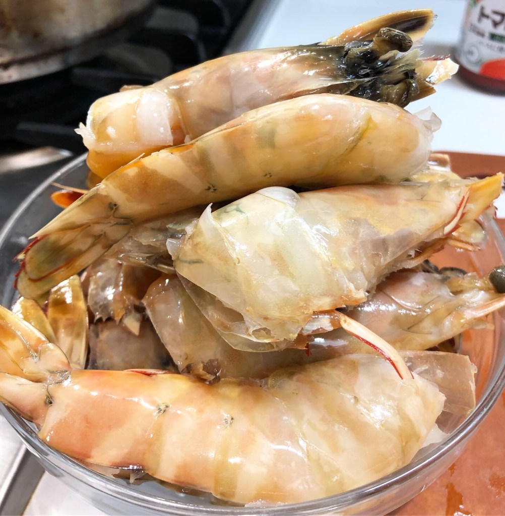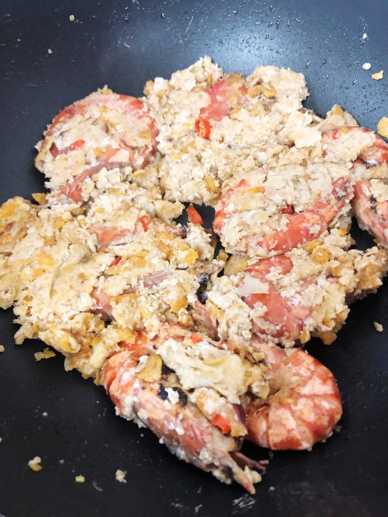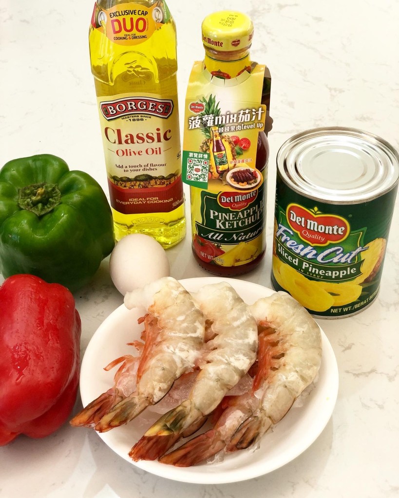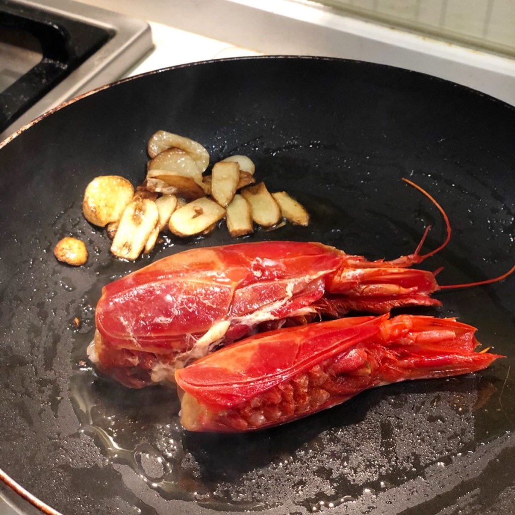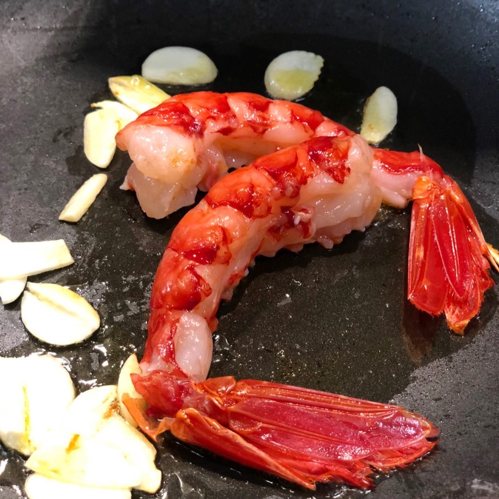 2) 熱鍋下橄欖油放入大蝦煎至八成熟後取出備用