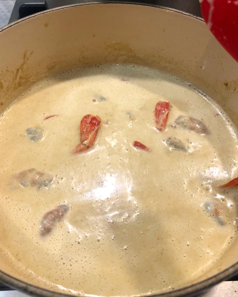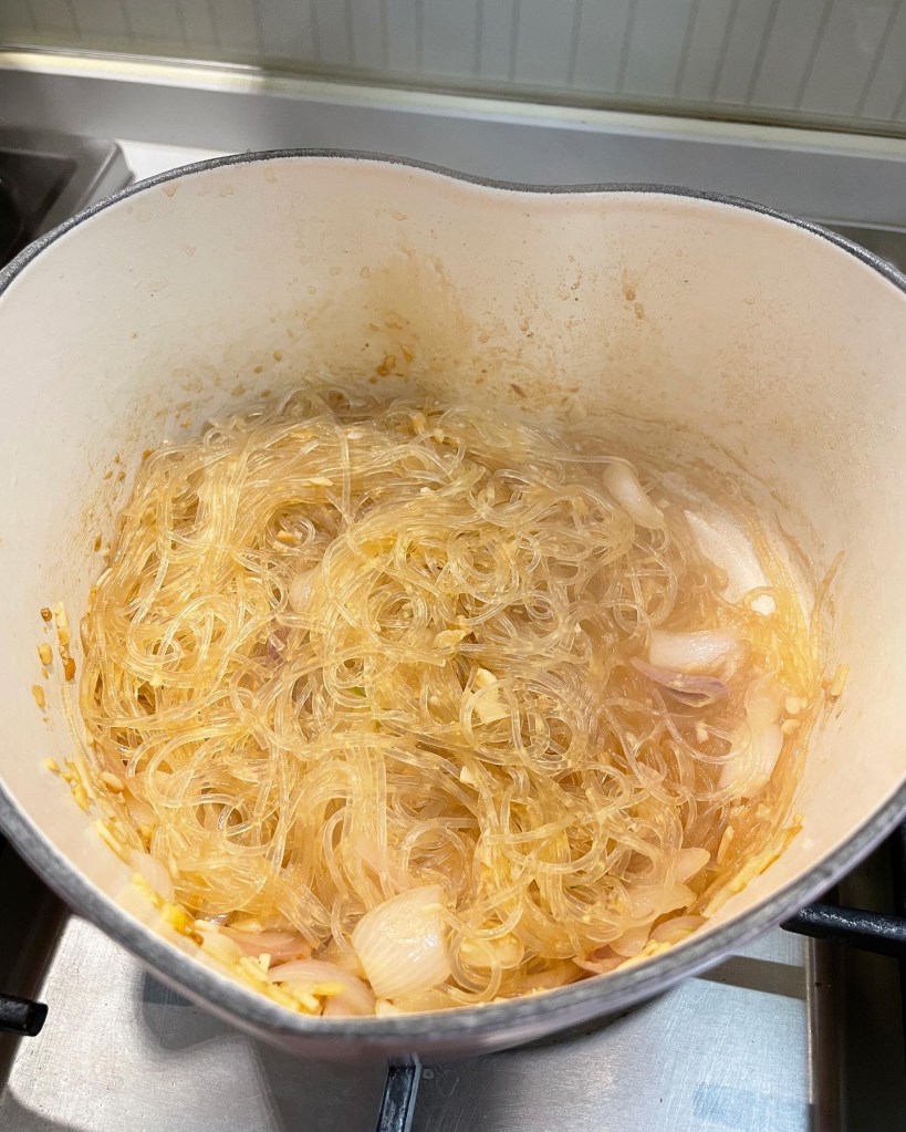 4) 待白酒的酒精揮發後,鋪平啲飯,便可以下魚湯、鹽和黑椒調味,滾起後上蓋轉細火煮10分鐘,期間不要攪拌