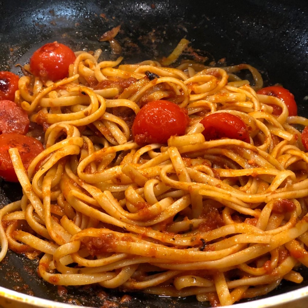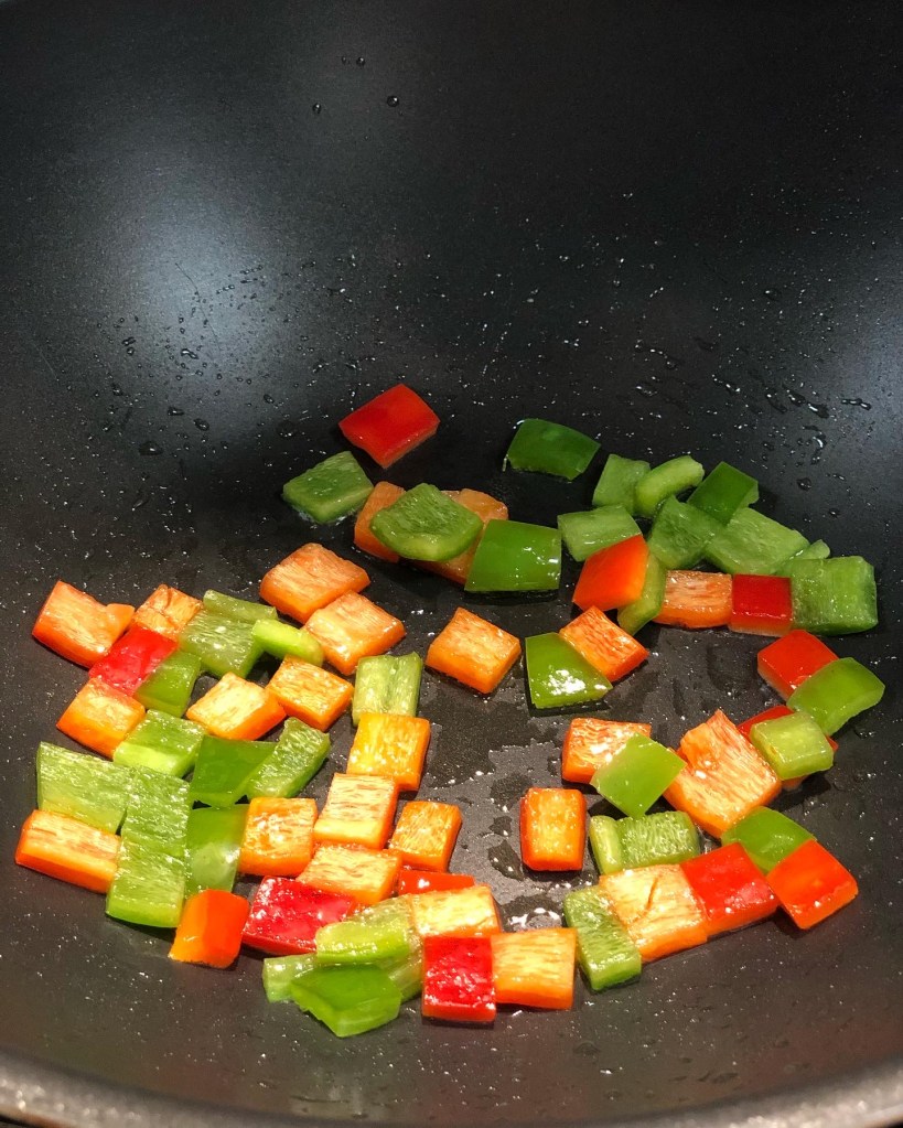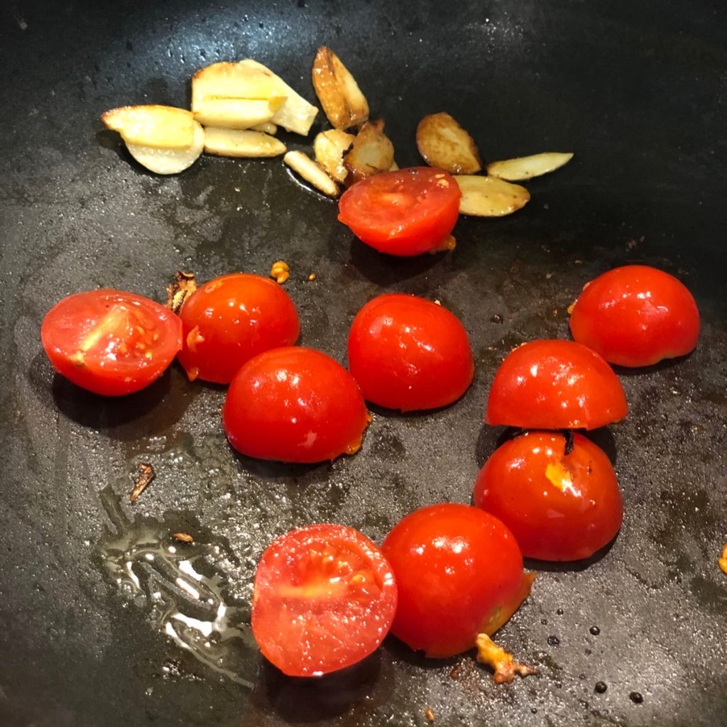 3) 同一隻鍋內放入洋蔥、紅椒和蒜蓉炒2分鐘,之後再加入西班牙腸和車厘茄炒多2分鐘,加入西班牙米和茄膏炒約1分鐘,然後加入紅椒粉、白酒和番紅花