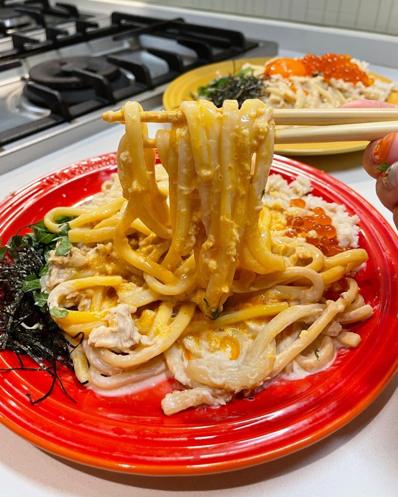 4) 先放上烏冬,再放上蛋黃、紫菜碎、蔥花和三文魚子即成✨