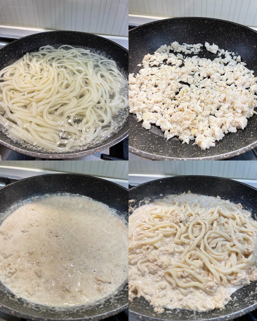 1) 燒滾熱水加1湯匙鹽,意大利粉按包裝指示減2分鐘來煮至Al Dente質感,撈起瀝乾備用