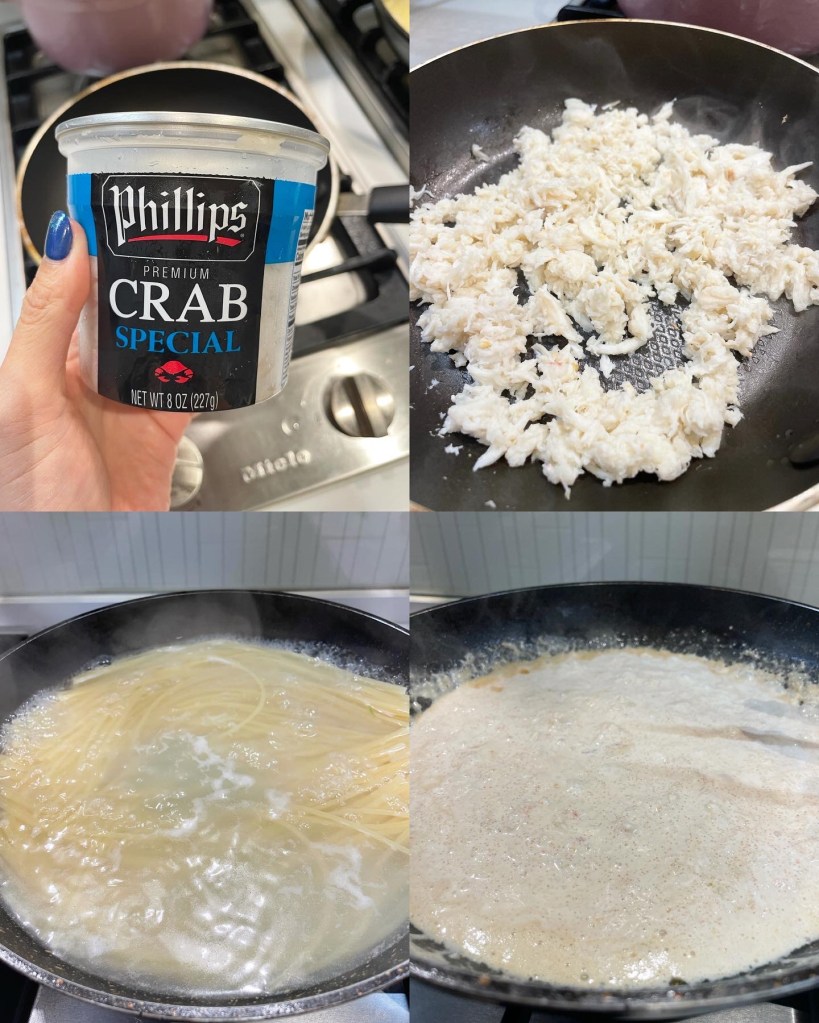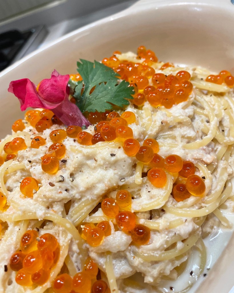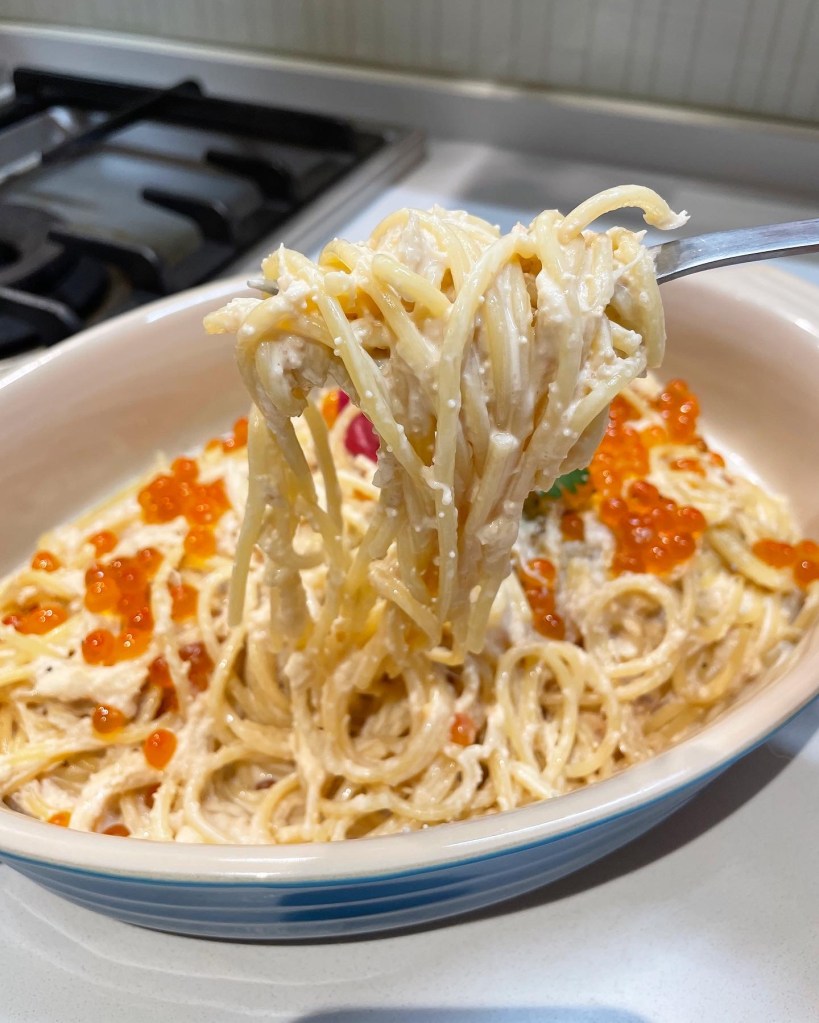 5) 細火下意大利粉和蟹肉!和明太子汁撈在一起,煮至醬汁濃稠,再加上三文魚子作裝飾即成💞