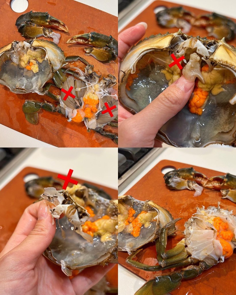 1) )如果怕活蟹的話,可以先放入雪櫃雪30-60分鐘,令牠沒有那麼活躍😅 用鉸剪在蟹咀中間大力剌下,然後打開蟹蓋,先去除中間的蟹胃和蟹咀,蟹身在中間切開,去除蟹腮!蟹鉗拿起,輕輕拍碎蟹殼方便食用,可以把部分蟹羔拿起,之後放在肉餅上或攪拌入肉餅中